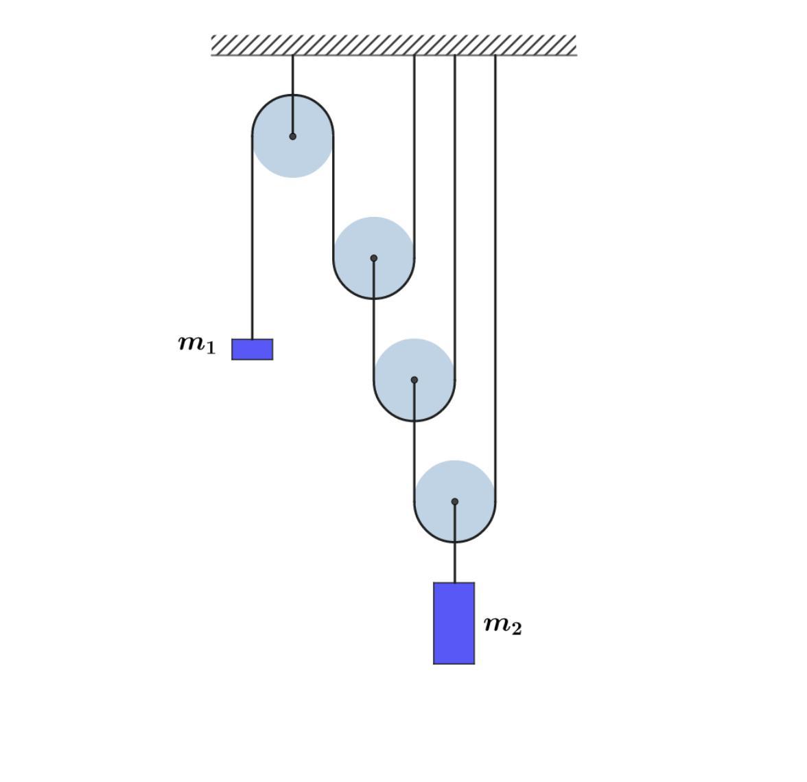 Два тела массами m1=5кг и m2 уравновешены так, как показано на рисунке. Блоки и нити считать невесомыми, трением пренебречь. Ускорение свободного падения считать равным 10 H/кг