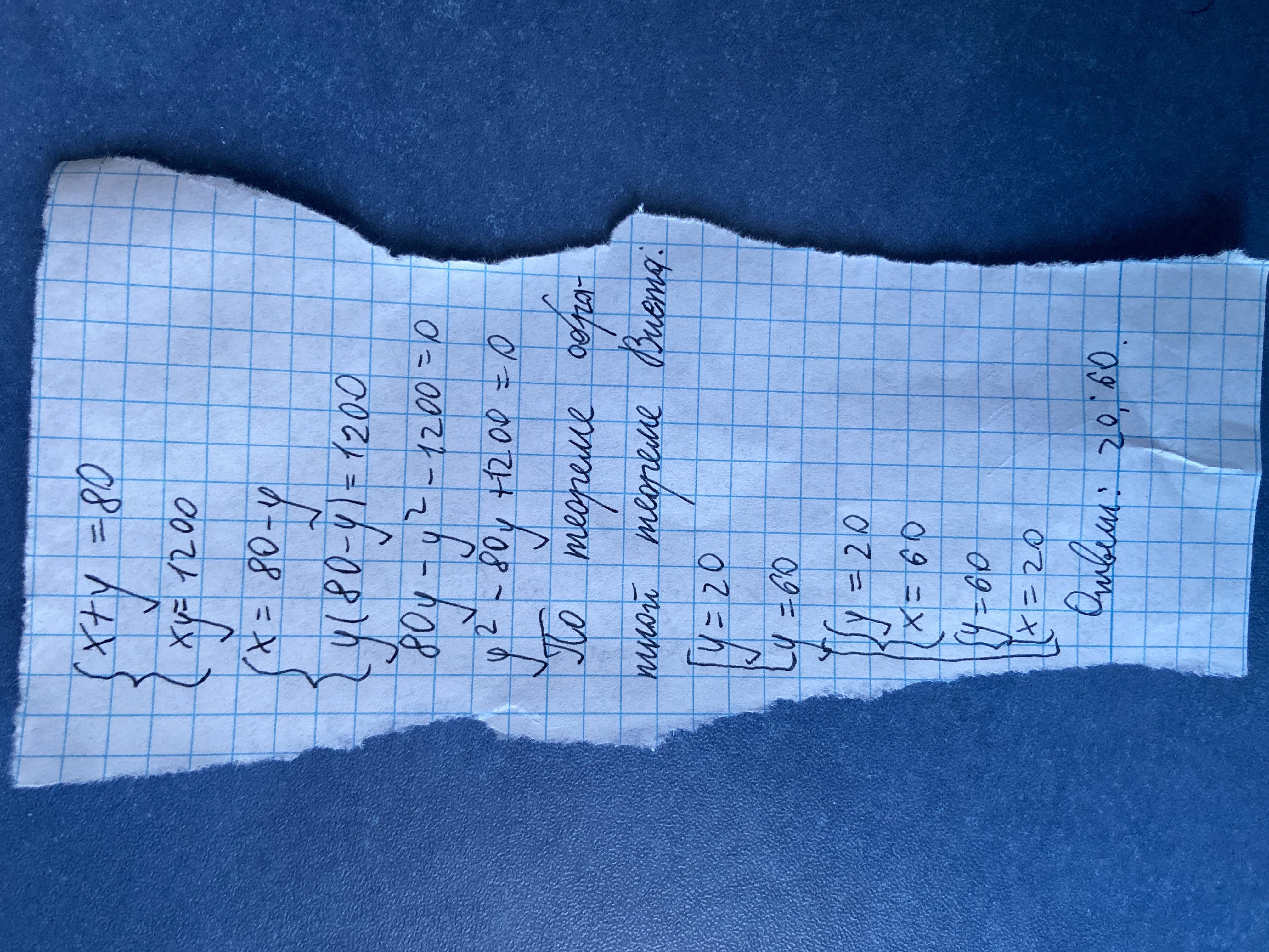 Сума двох чисел дорівнює 80, а добуток 1200.Знайдіть ці числа.