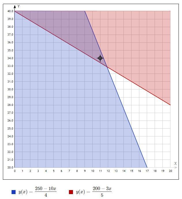 Область определения первого условия лежит под графиком y = (250-10x)/4 (указана прозрачно синим цветом),