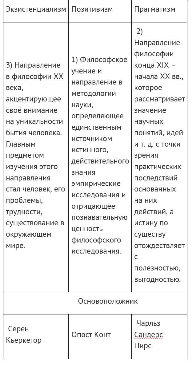 2. Соотнесите название философского учения, определение и имя основоположника данного учения. Определения 1) Философское учение и направление в методологии науки, определяющее единственным источником истинного, действительного знания, эмпирические исследования и отрицающее познавательную ценность философского исследования. 2) Направление философии конца XIX- начала XX вв., которое рассматривает значение научных понятий, идей и т. д. с точки зрения практических последствий основанных на них действий, а истину по существу отождествляет с полезностью, Выгодностью. 3) Направление в философии XX века, акцентирующее своё внимание на уникальности бытия человека. Главным предметом изучения этого направления стал человек, его проблемы, трудности, существование в окружающем мире. Основоположники D. Огюст Конт Е. Чарльз Сандерс Пирс F. Серен Кьеркегор Экзистенциализм Позитивизм Прагматизм Основоположник
