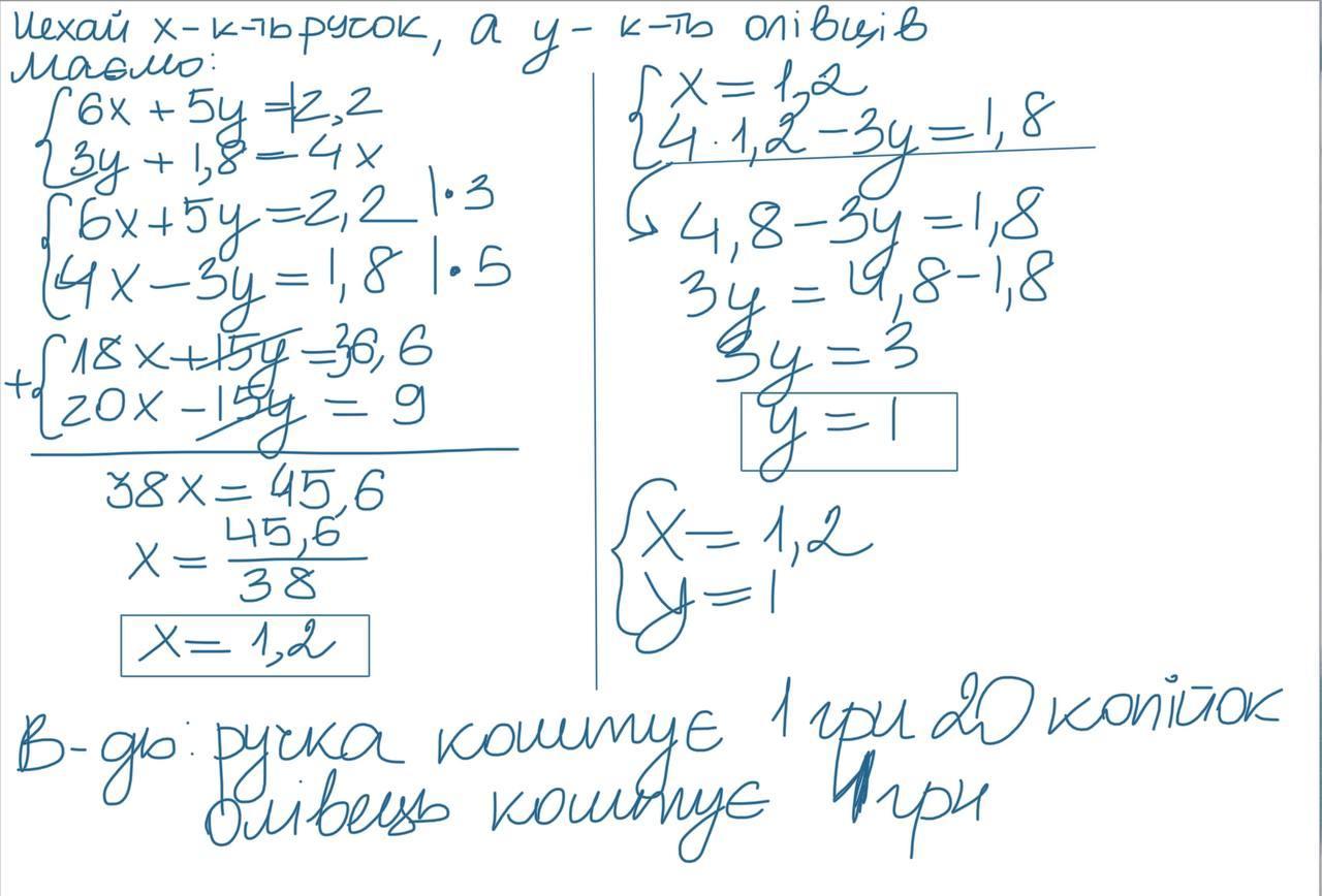 За 6 ручок і 5 олівців разом заплатили 12 грн 20 коп. Скільки коштує одна ручка і скільки - один олівець, якщо 4 ручки дорожчі 3 олівців на 1 грн 80 коп.?
