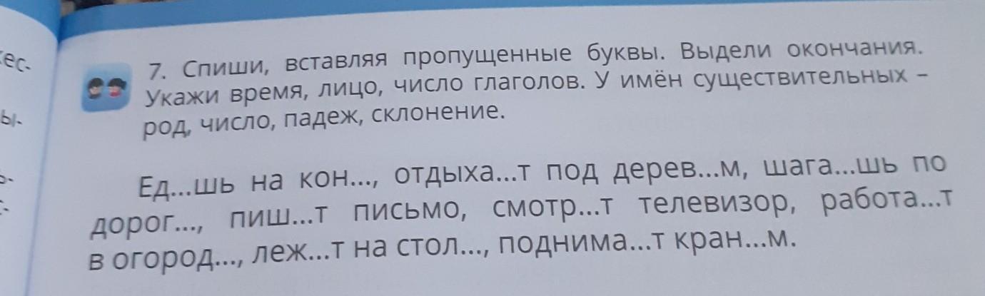 7. Спиши, вставляя пропущенные буквы. Выдели окончание. Укажи время, лицо, число глаголов. У имён существительных–род, число, падеж, склонение.
