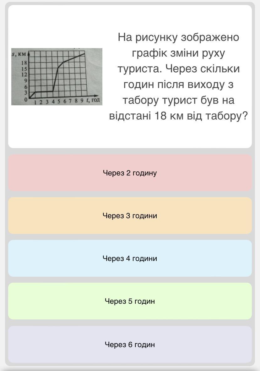 Ответ:Через 6 годин після виходу з табору турист був на відстані 18 км від табору.