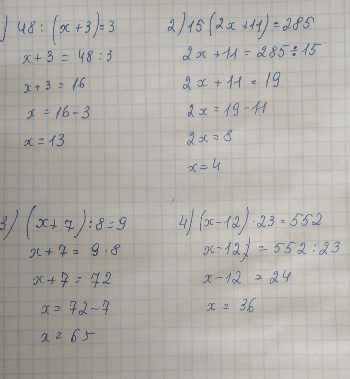 Розв'язати рівняння 1) 48:(x+3)=3 2) 15*(2x+11)=285 3) (x+7):8=9 4) (x-12)*23=552