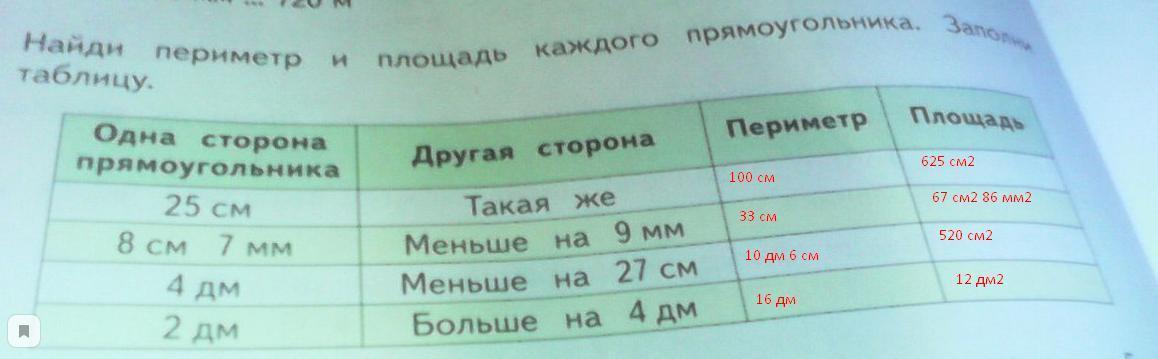 3. Найди периметр таблицу. площадь каждого прямоугольника. Заполни Одна сторона прямоугольника Другая сторона Периметр Площадь 25 см 8 см 7 мм Такая же за Меньше на 9 мм Меньше на 27 см Больше на 4 дм 4 дм 2 дм