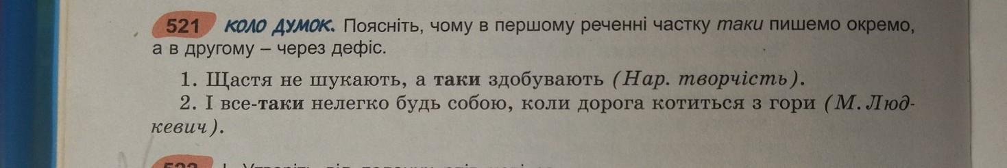 521 . Поясніть, чому в першому реченні частку таки пишемо окремо, а в другому – через дефіс.