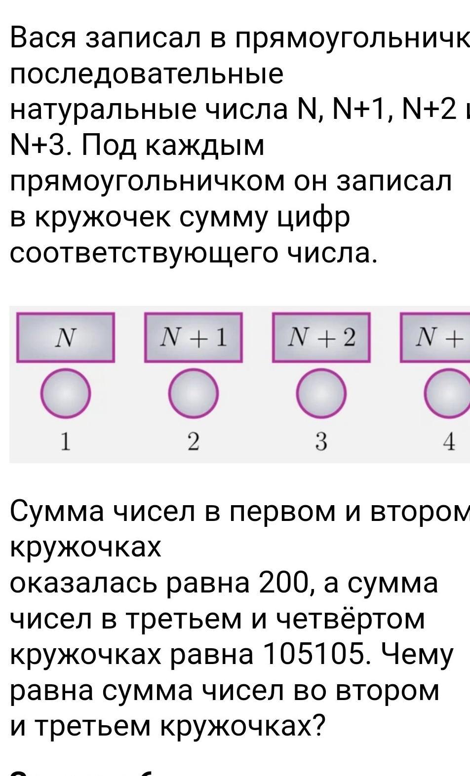 .Вася записал в прямоугольнички последовательные натуральные числа N, N+1, N+2 и N+3. Под каждым прямоугольничком он записал в кружочек сумму цифр соответствующего числа.