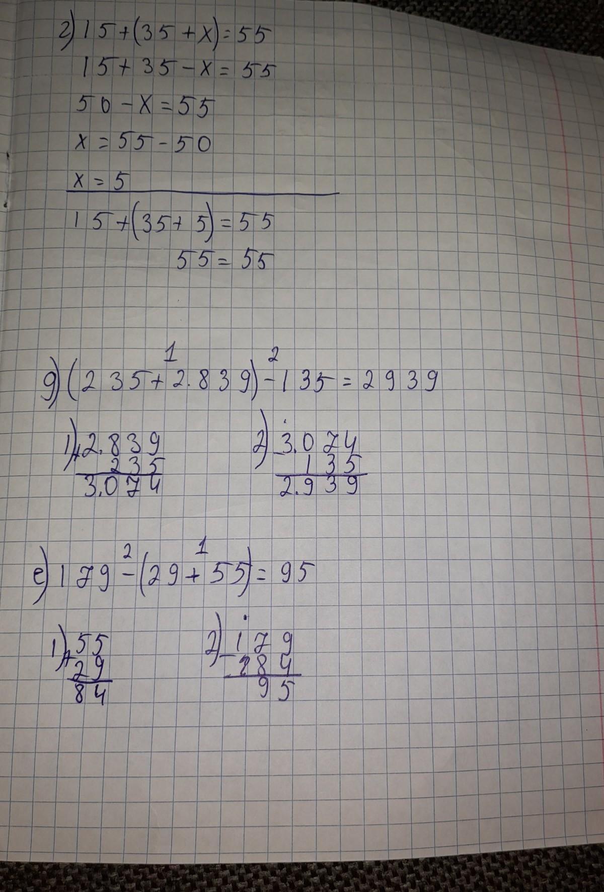 Решить уравнения: а) 203902+x=1239022 б) 29304-x=220 в) 160-(40+x)=60 г) 15+(35+x)=55 Вычислить с помощью свойств: д) (235+2839)-135 е) 179-(29+55) ж) (234+292)-134
