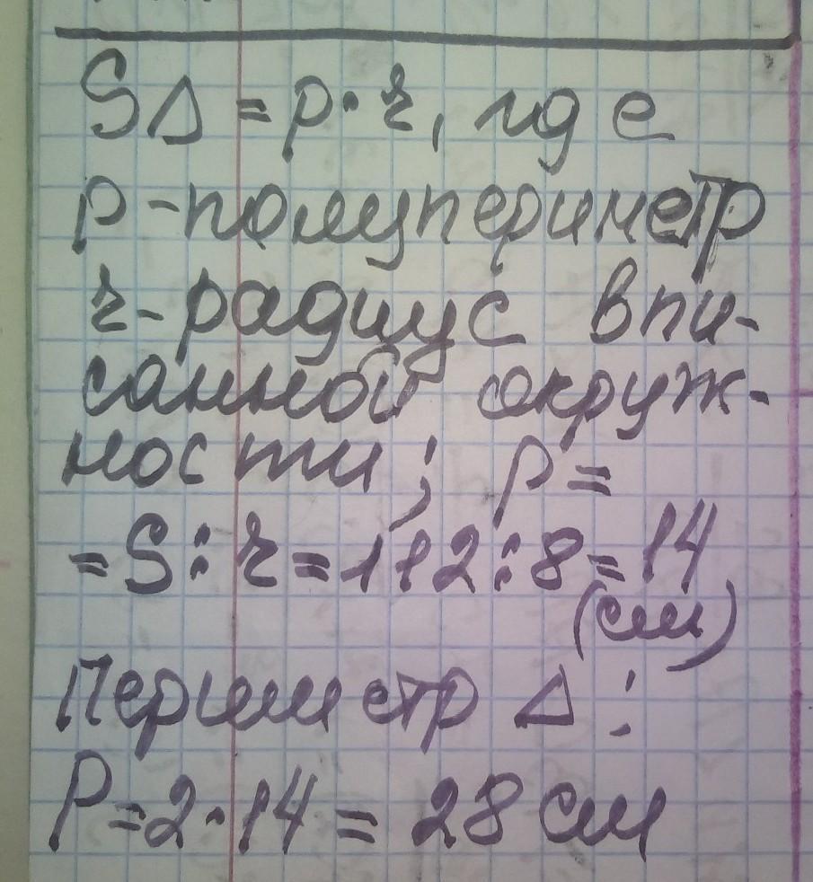 Площадь треугольника АВС = 112 см^2, R вписанной окружности = 8 см. Найдите периметр этого треугольника.