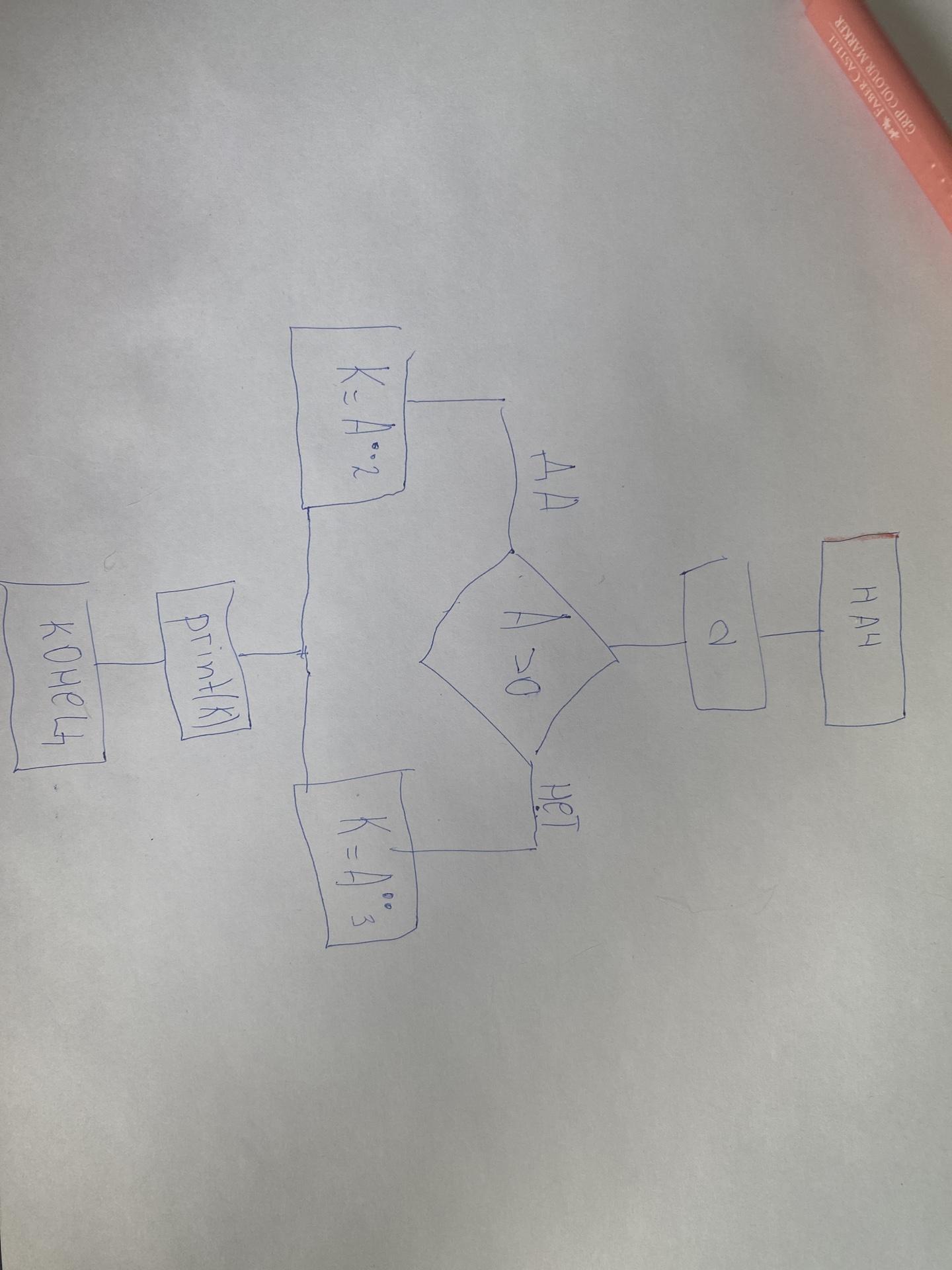 помогите пожалуйста!!! Нарисуйте блок-схему по данной программе: A=int(input()) if A>0: К=A**2 else: К=A* *3 print(K)