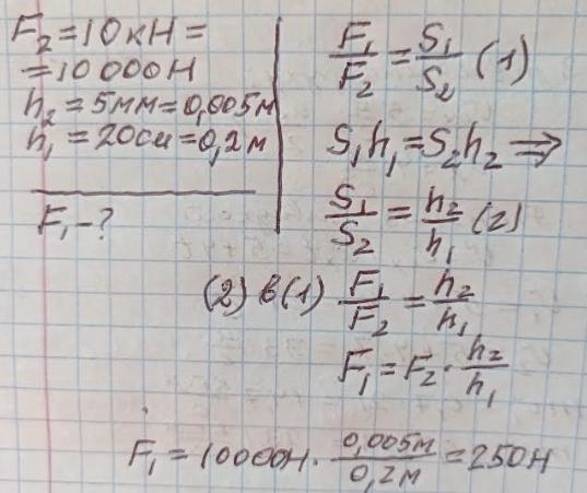 . У результат стискання детал гра пресом силою 10 кН великий поршень піднялся на 5 мм. Яку силу було прикладено до малого поршня, якщо опустився на 20 см?