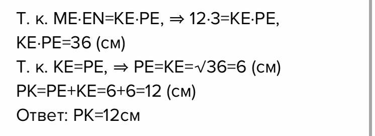 Хорды MN и PK пересекаются в точке E так что ME = 12 см NE = 3 см PE = 9 см