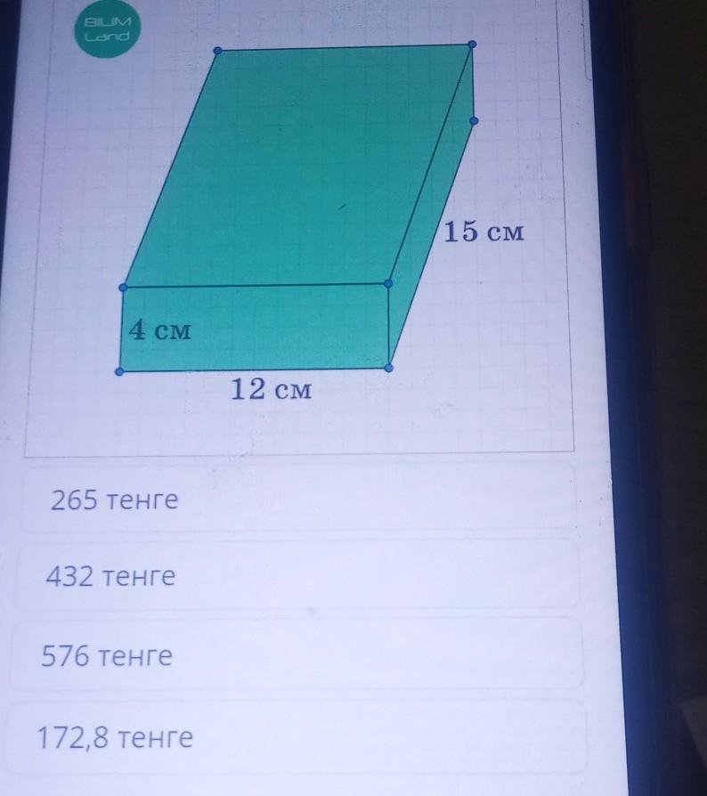 Талгат и Ернар решили изготовить для сувениров праздничные коробки, длина которых равна 15 см, ширина - 12 см и высота – 4 см. 1 м2 картона стоит 400 тенге. Сколько потребуется денег, чтобы купить картон для изготовления 25 коробок?