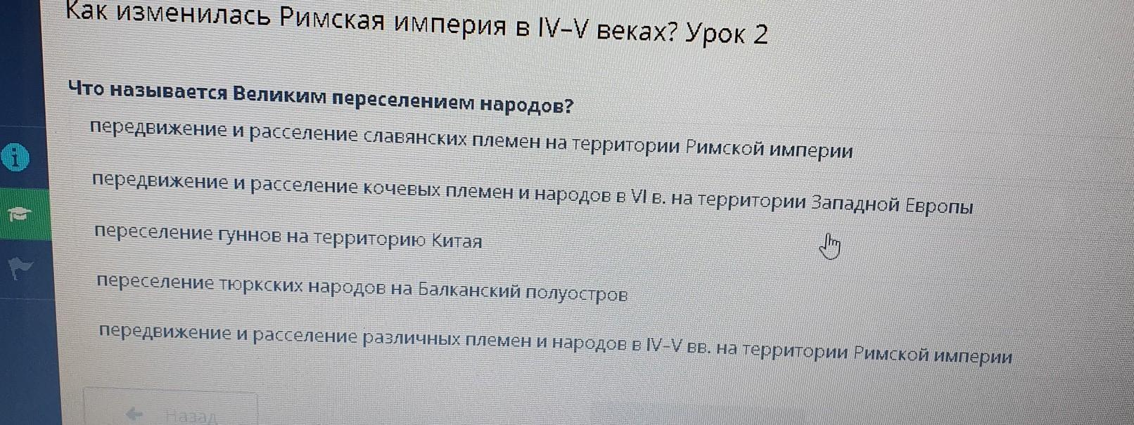 Что называется Великим переселением народов? передвижение и расселение славянских племен на территории Римской империи передвижение и расселение кочевых племен и народов в VI в. на территории Западной Европы переселение гуннов на территорию Китая переселение тюркских народов на Балканский полуостров передвижение и расселение различных племен и народов в IV-V вв. на территории Римской империи