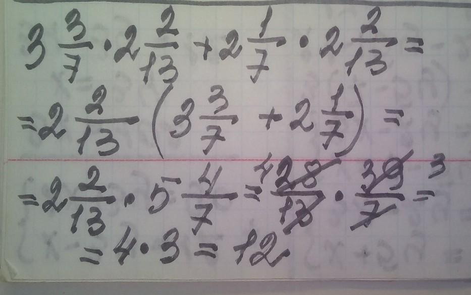 2. 2/13 * (3. 3/7 + 2. 1/7) = 2. 2/13 * 5. 4/7 = 28/13 * 39/7 = 4/1 * 3/1 = 12/1 = 12