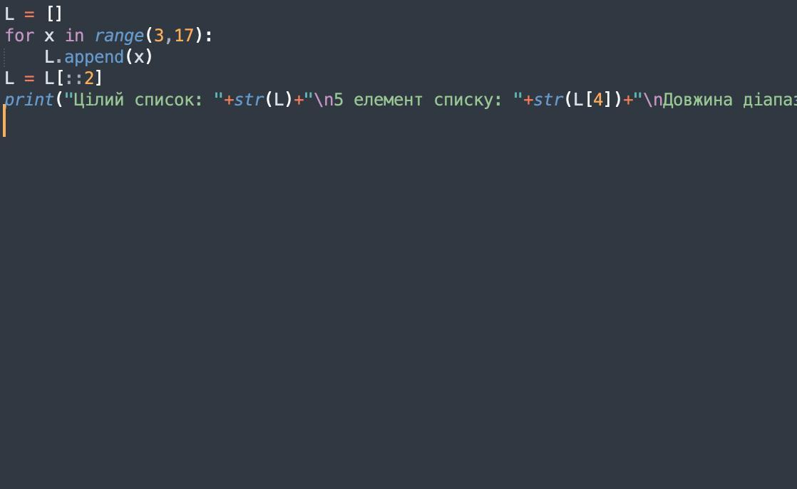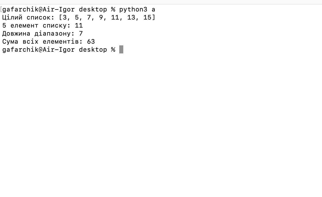 список, викликати значення елемента на п’ятій позиції, визначити довжину діапазону та суму всіх елементів.