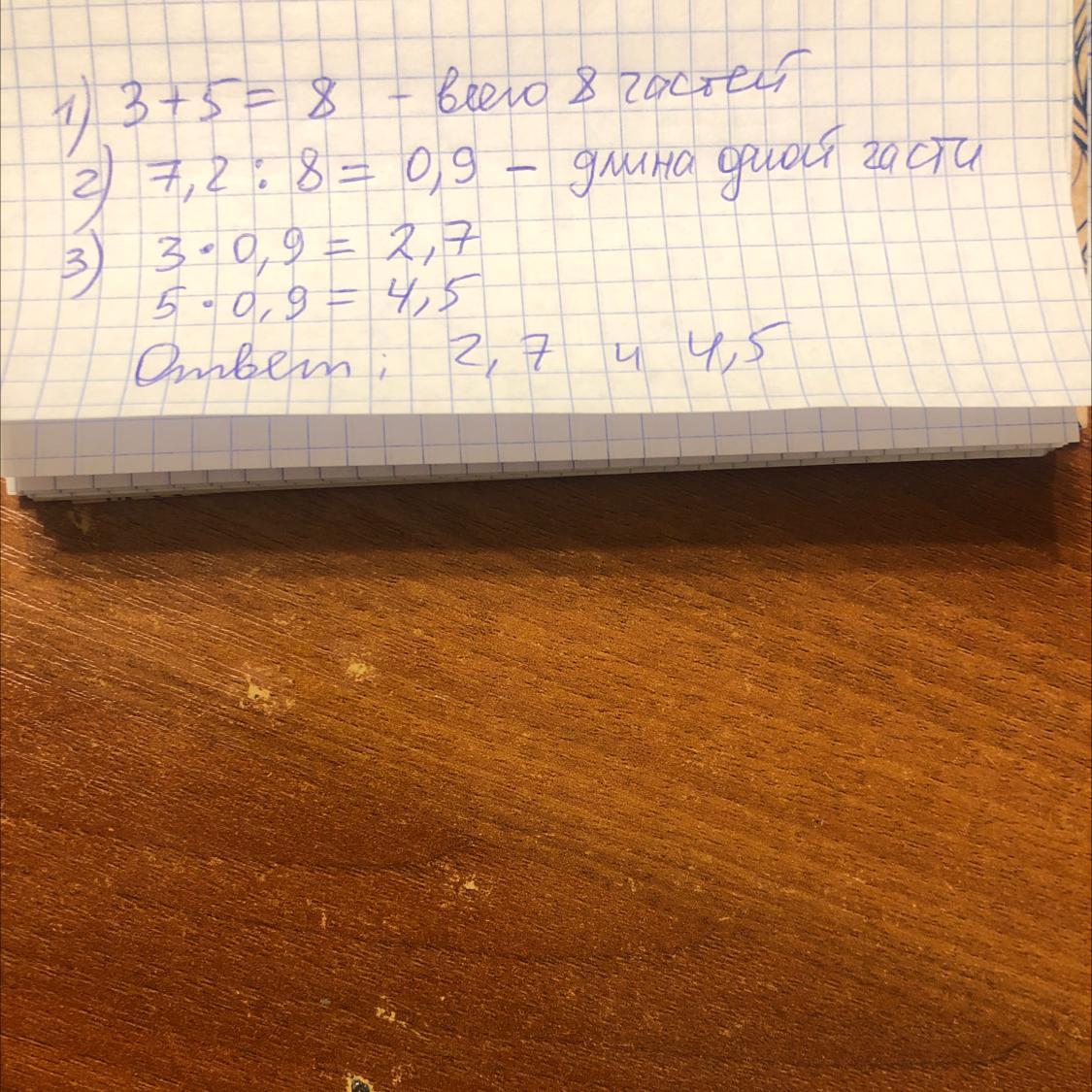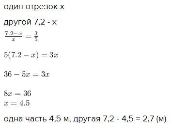 Дано число 7,2 его разделили на части которые пропорциональны числам 3 и 5 найдите длины этих отрезков