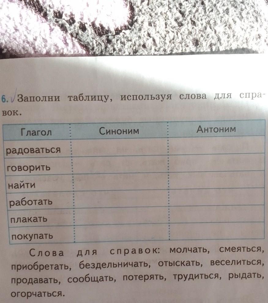 Заполни таблицу, используя слова для спра- вок. Глагол Синоним Антоним помогите сделать пожалуйста.спасибо заранее