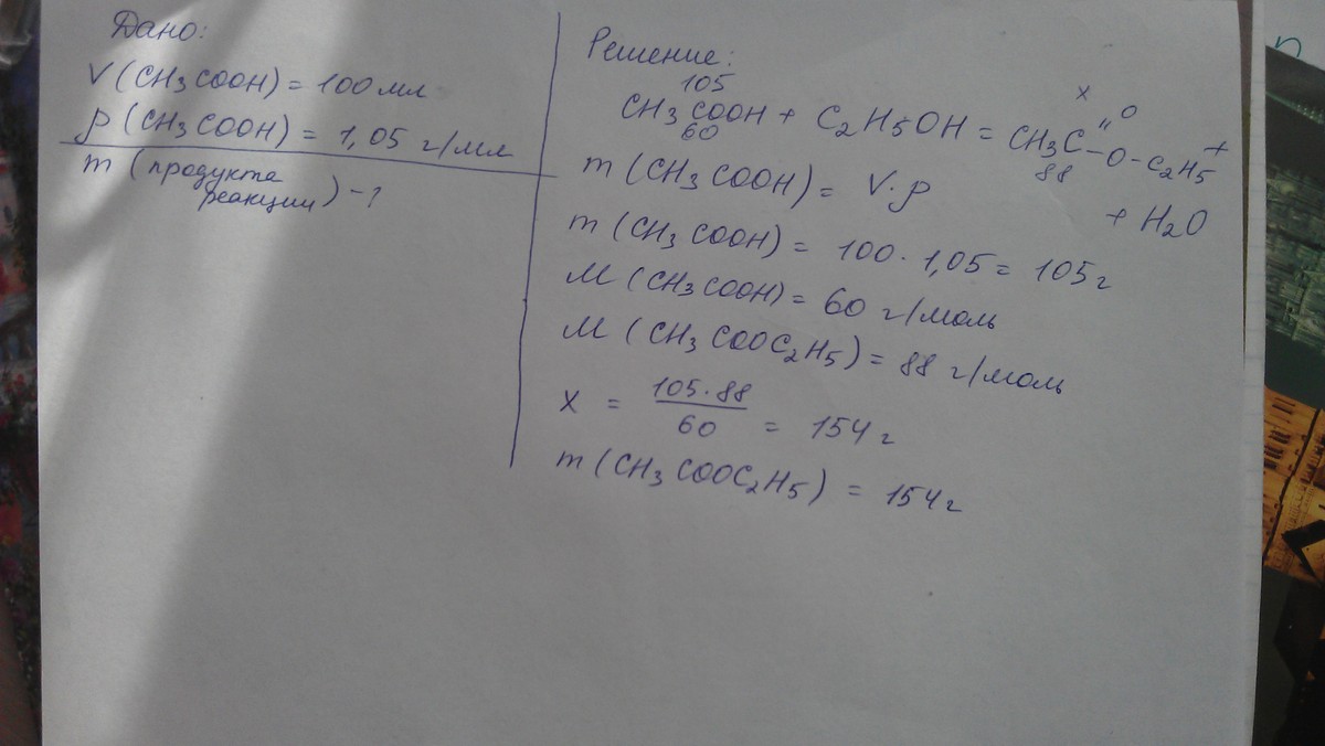 Обчисліть масу продукту реакції, який утворюється при взаємодії оцтової кислоти об'ємом 100мл (густина - 1,05 г/моль) з етанолом