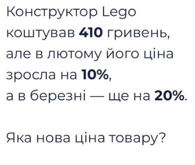 1) 410 + (410 * 0,1) = 410 + 41 = 451 (грн) - стал стоить конструктор в феврале