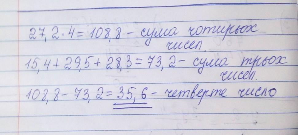 Середнє арифметичне чотирьох чисел дорівнює 27,2.Три з них відповідно дорівнюють 15,4, 29,5 і 28,3. Знайди четверте число