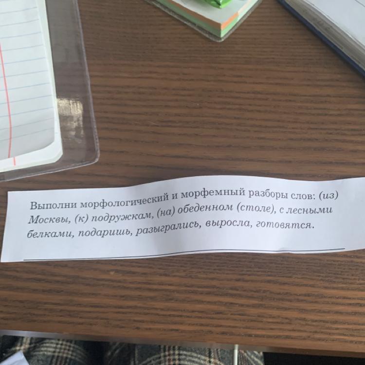 Выполни морфологический и морфемный разборы слов: (из) Москвы, (к) подружкам, (на) обеденном (столе), с лесными белками, подаришь, разыгрались, выросла, готовятся.