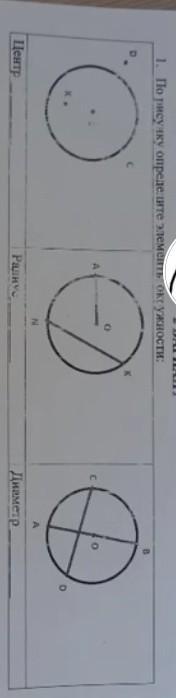 1. По рисунку определите элементы окружности: Центр-D,c,k Радиус-A,O,K,N Диаметр-C,O,O,A,B