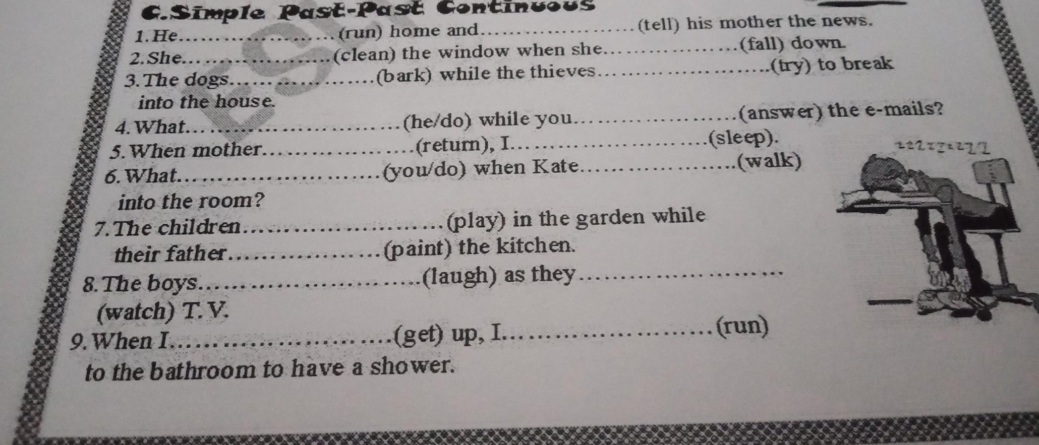 Ответ: 1) running 2) telling 3) cleaning 4) falling 5) barking 6) trying 7) he doing 8) answering 9) returning 10) sleeping 11) you doing 12) walking 13) playing 14) painting 15) laughing 16) watching 17) getting 18) running