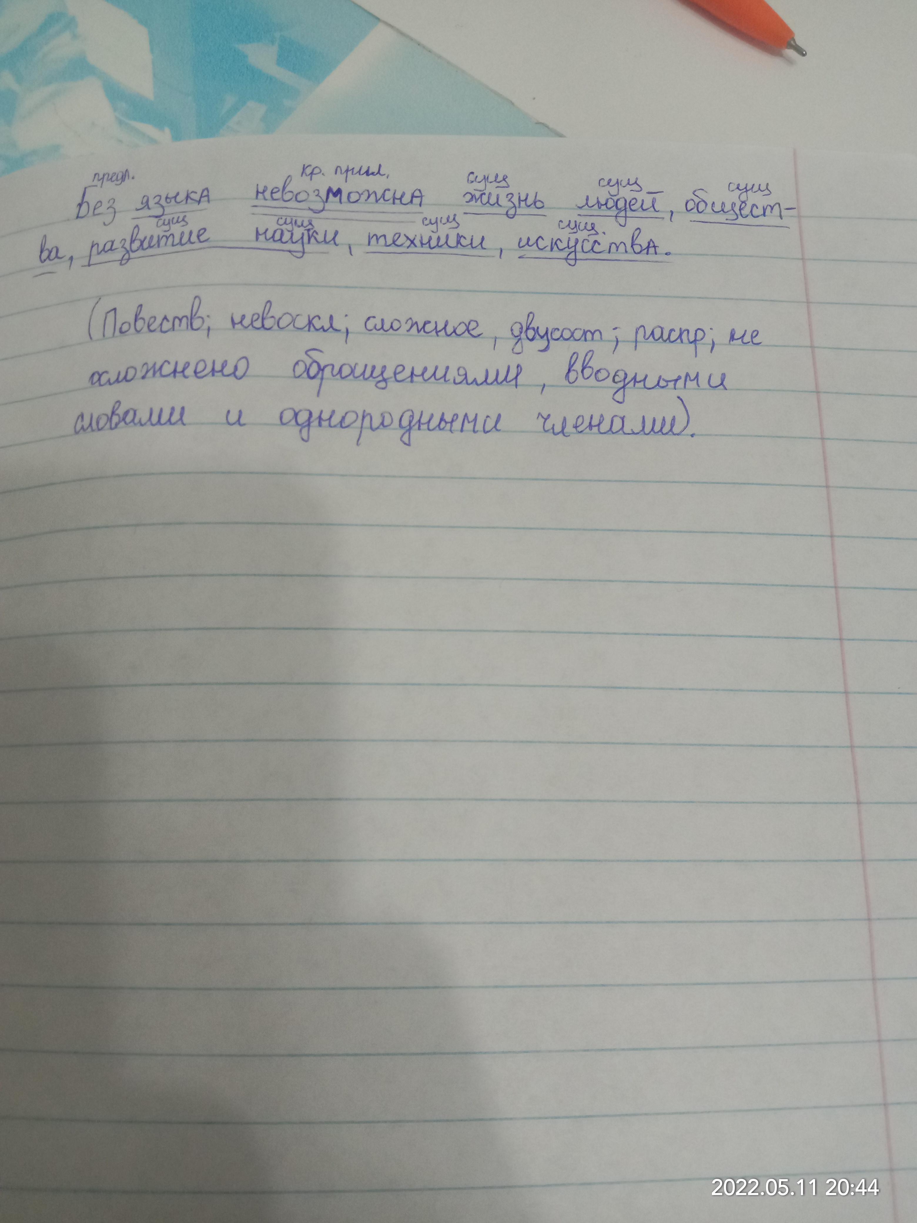 Синтаксический разбор предложения "Без языка невозможна жизнь людей,общества,развитие науки,техники,искусства