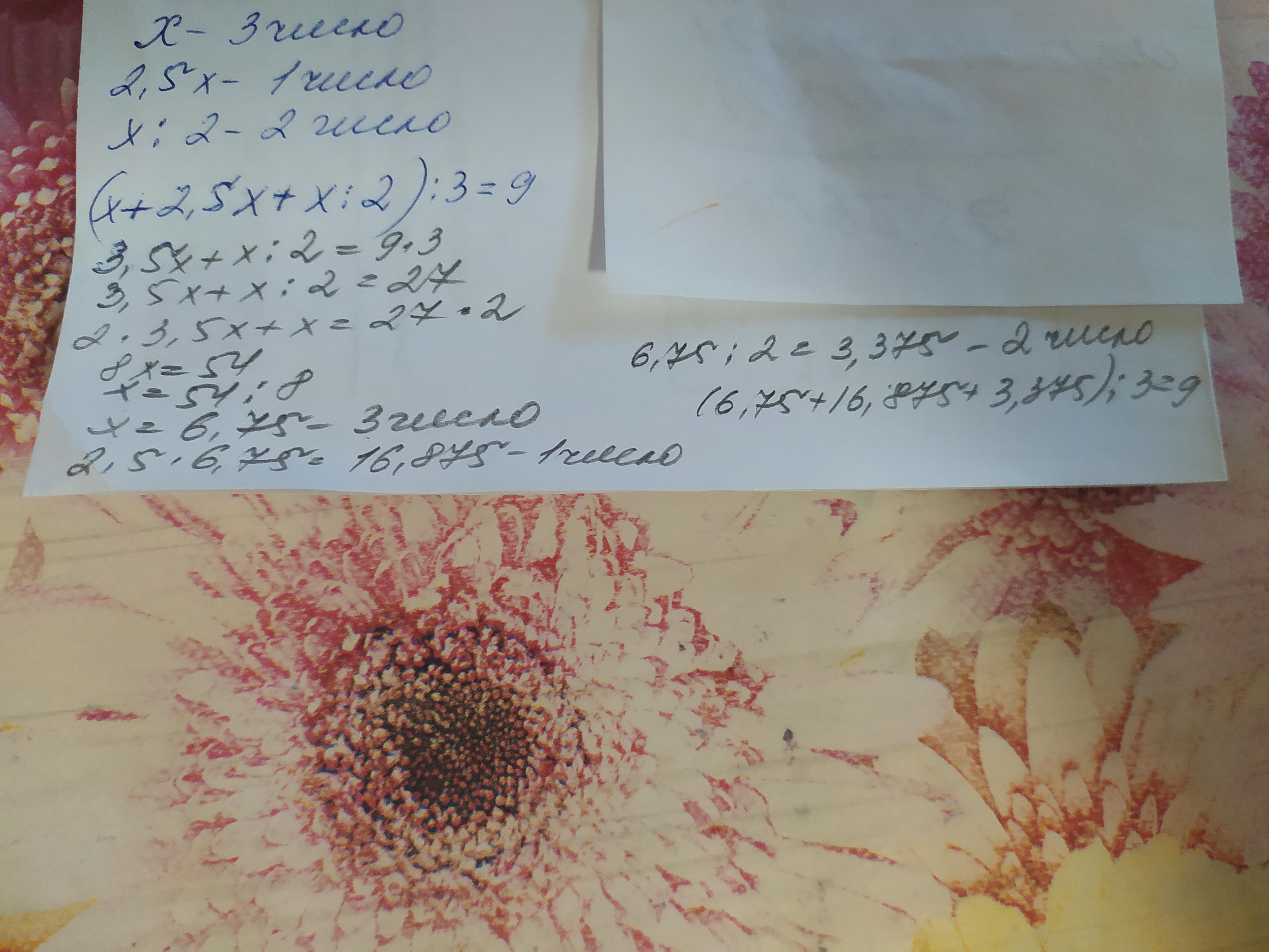 Среднее арифметическое трёх чисел — 9.Найди эти числа, если первое число в 2,5 раз больше третьего, а второе в 2 раз(-а) меньше третьего.