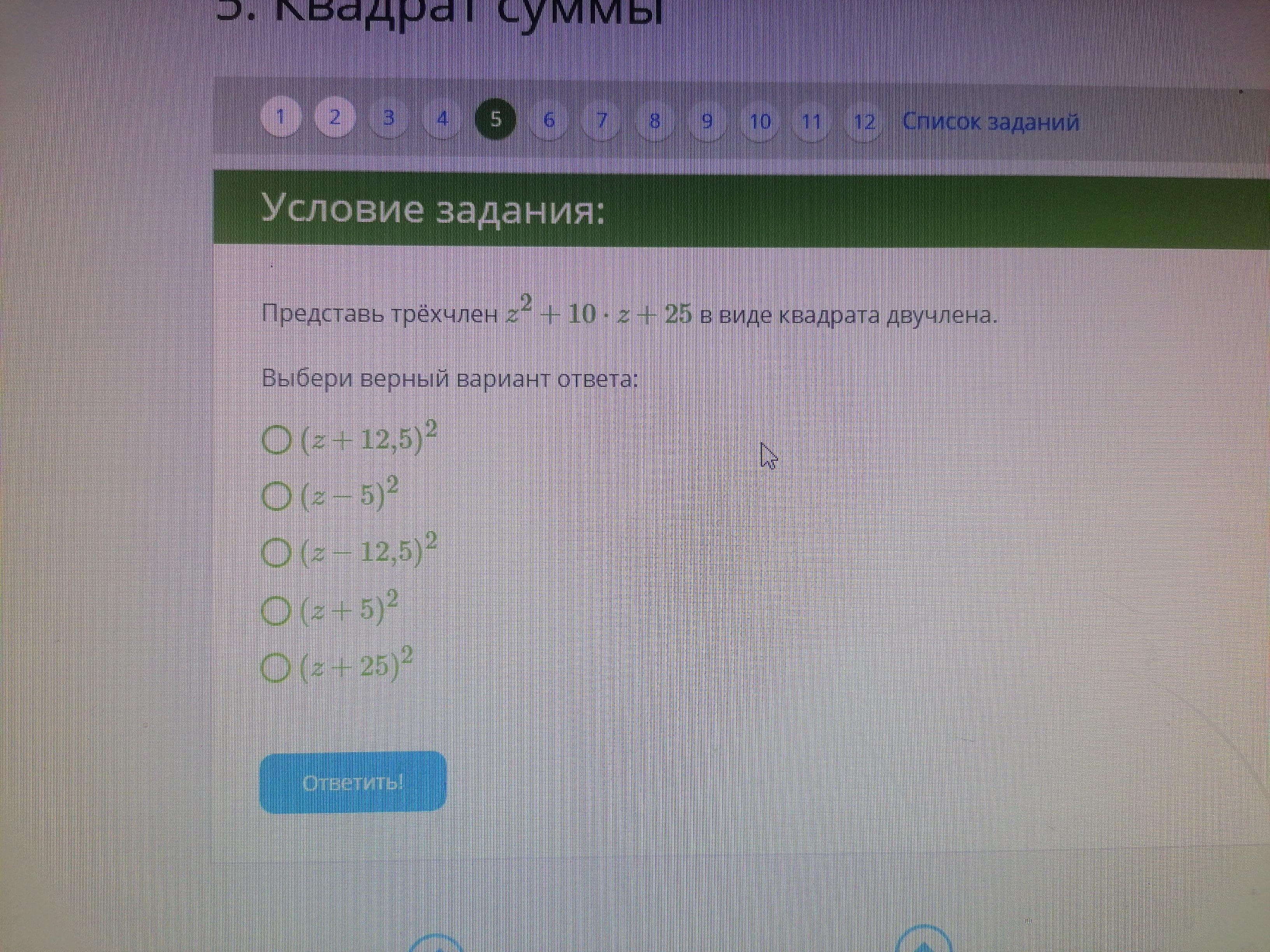 z^{2} + 10 * z + 25 = z^{2} + 2 * 5 * z + 5^{2} = (z+5)^{2} по формуле "квадрат суммы"