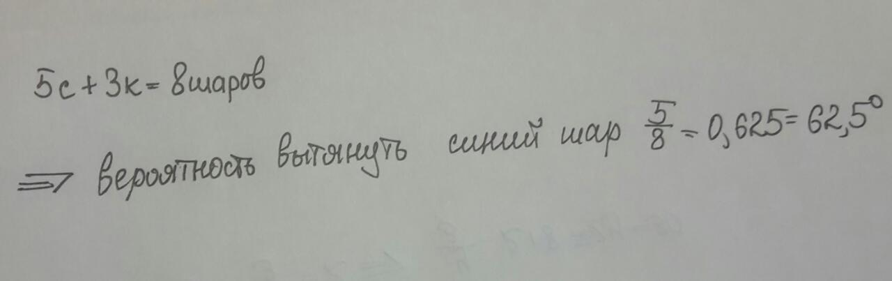 В коробке 5 синих и 3 красных шара. Один за другим шары вынимались из коробки. В-третьих, найти вероятность выпадения синего шара.