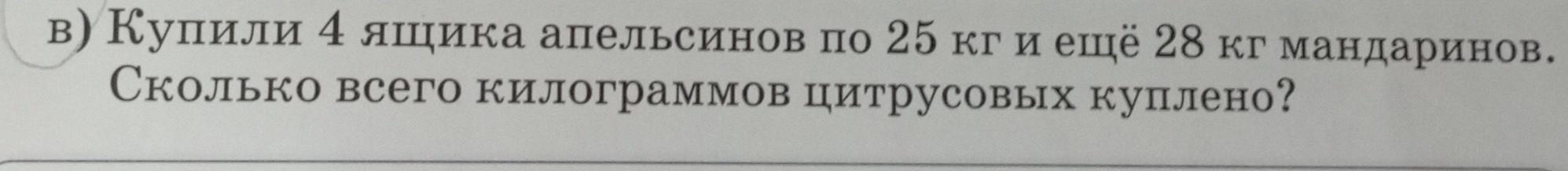 в) Купили 4 ящика апельсинов по 25 кг и ещё 28 кг мандаринов. Сколько всего килограммов цитрусовых куплено?. Математика 3 класс помогите плз