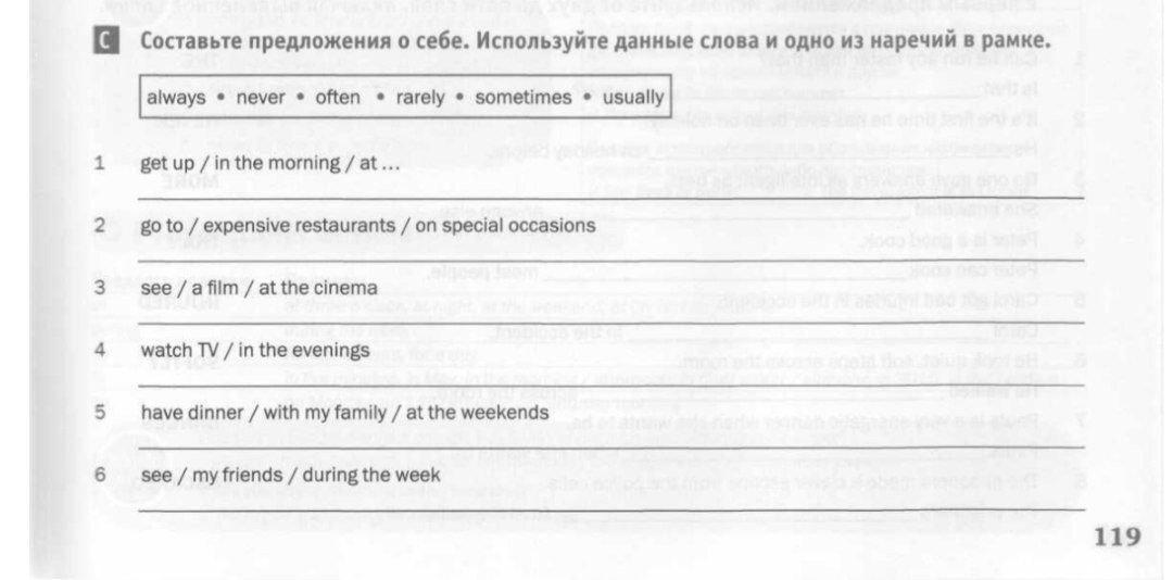 С Составьте предложения о себе. Используйте данные слова и одно из наречий в рамке.