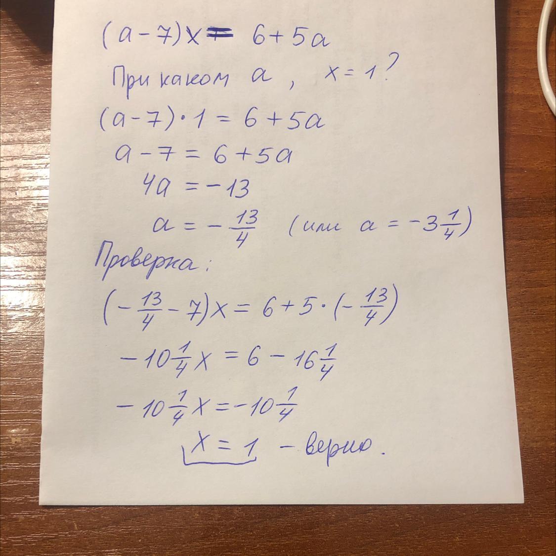 При каком значении a уравнение: (а -7)х=6+5а имеет корень, равный числу 1?