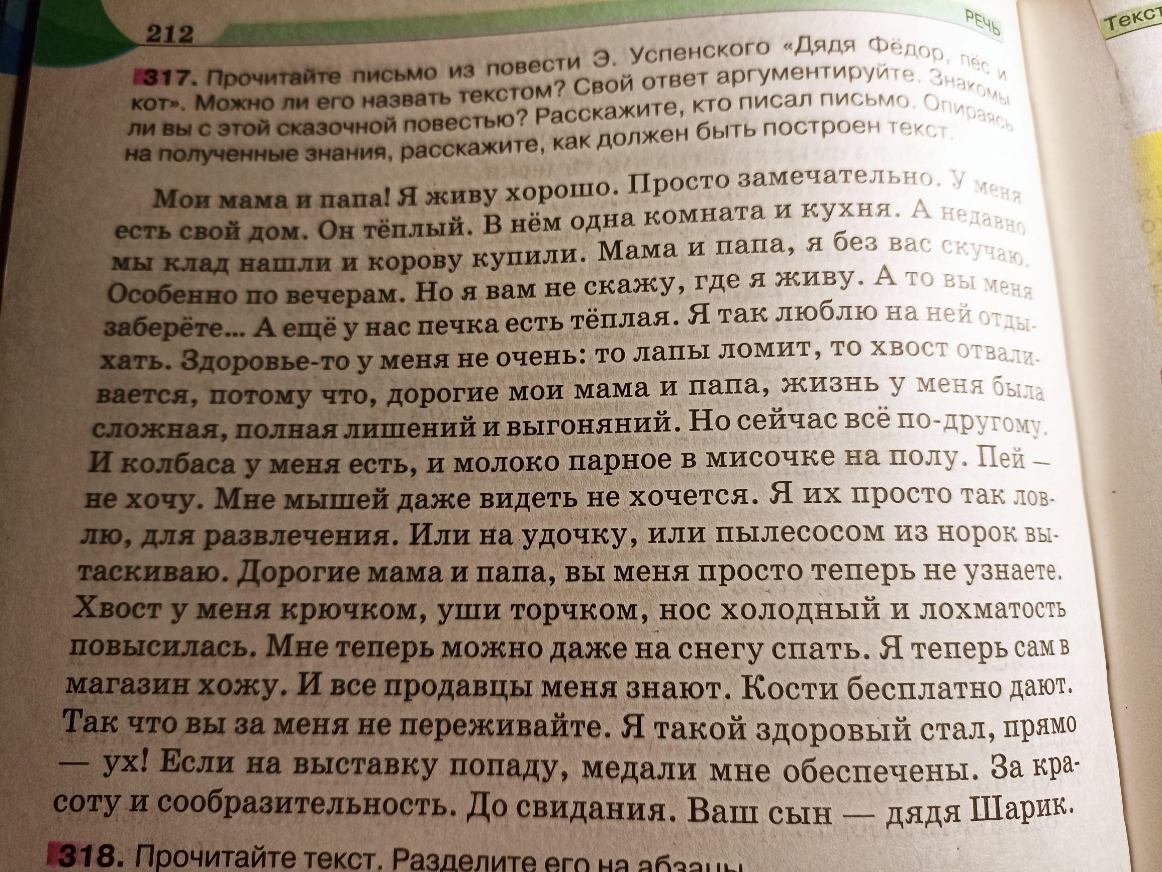 Прочитайте письмо из повести Э. Успенского «Дядя Федор, рес, и кот». Можно ли его назвать текстом? Свой ответ аргументируйте. ЗначONлы ли вы с этой сказочной повестью? Расскажите, кто писал письмо. Опираясь на полученные знания, расскажите, как должен быть построен текст