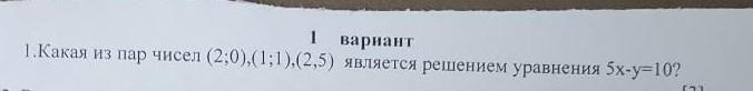 Какая из пар чисел (2;3),(1;1), (2,5) является решением уравнения 5х-у-10? СРОООЧНО СОР ДАМ 30 БАЛЛОВ (решите с решением)