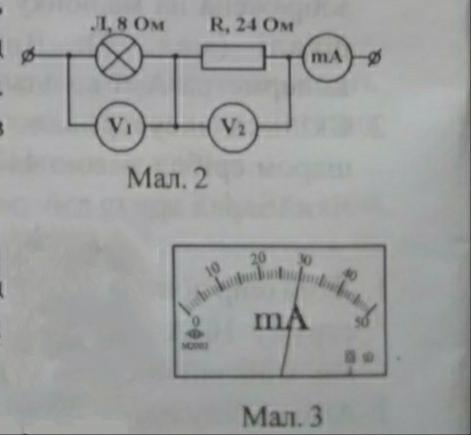 Покази міліамперметра mA у колі , схема якого зображена на малюнку 2, відображені на шкалі 3 (мал.3). Визначити покази вольтметрів V1 i V2