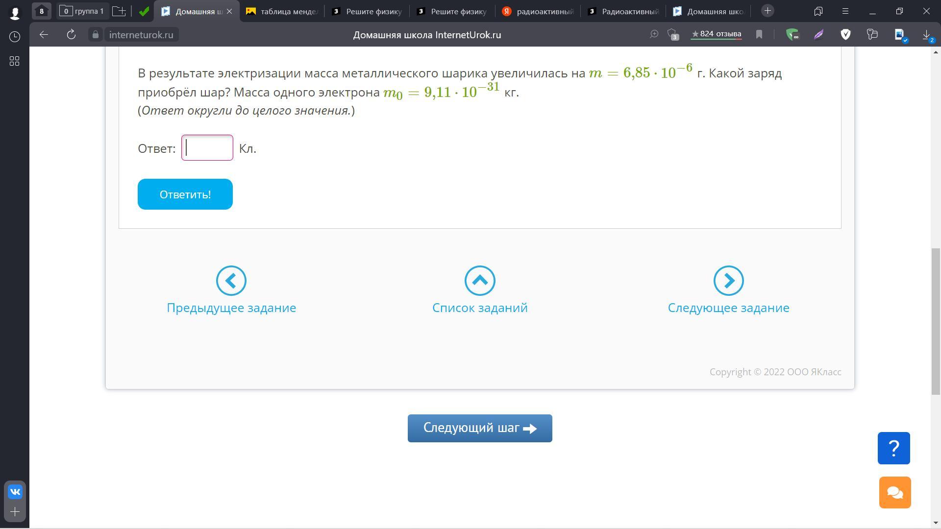 n = m/m0 = 6,85*10^-6 / 9,11*10^-31 ≈ 7,52 * 10^-38 Кл