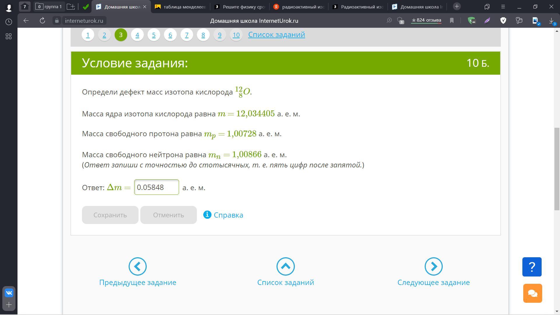 ∆m = Mp + Mn - Мя = 8,05824 + 12,10392 - 20,10368 = 0,05848 а.е.м