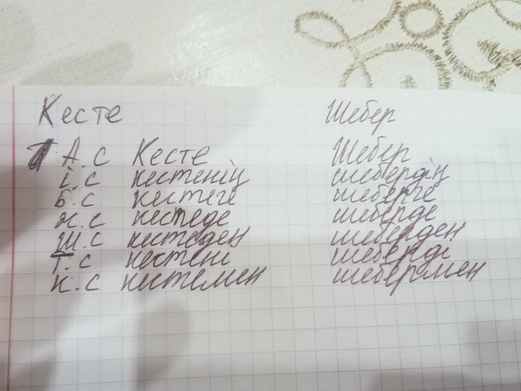 Кесте сөзімен Шебер сөзін септеп дәптерге жазып көрсеттім
