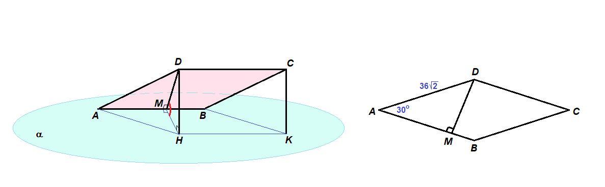 Через сторону АВ ромба АВСD проведено площину а, що утворює з площиною ромба кут 45°. Обчисліть відстань від прямoї CD до площини а, якщо гострий кут ромба дорівнює 30° і АВ=36√2