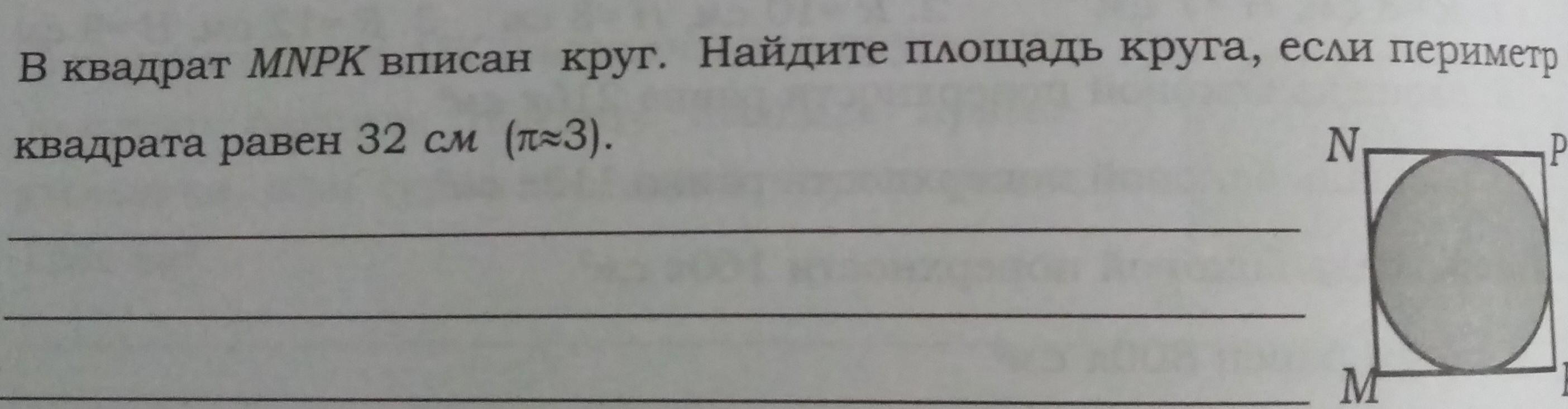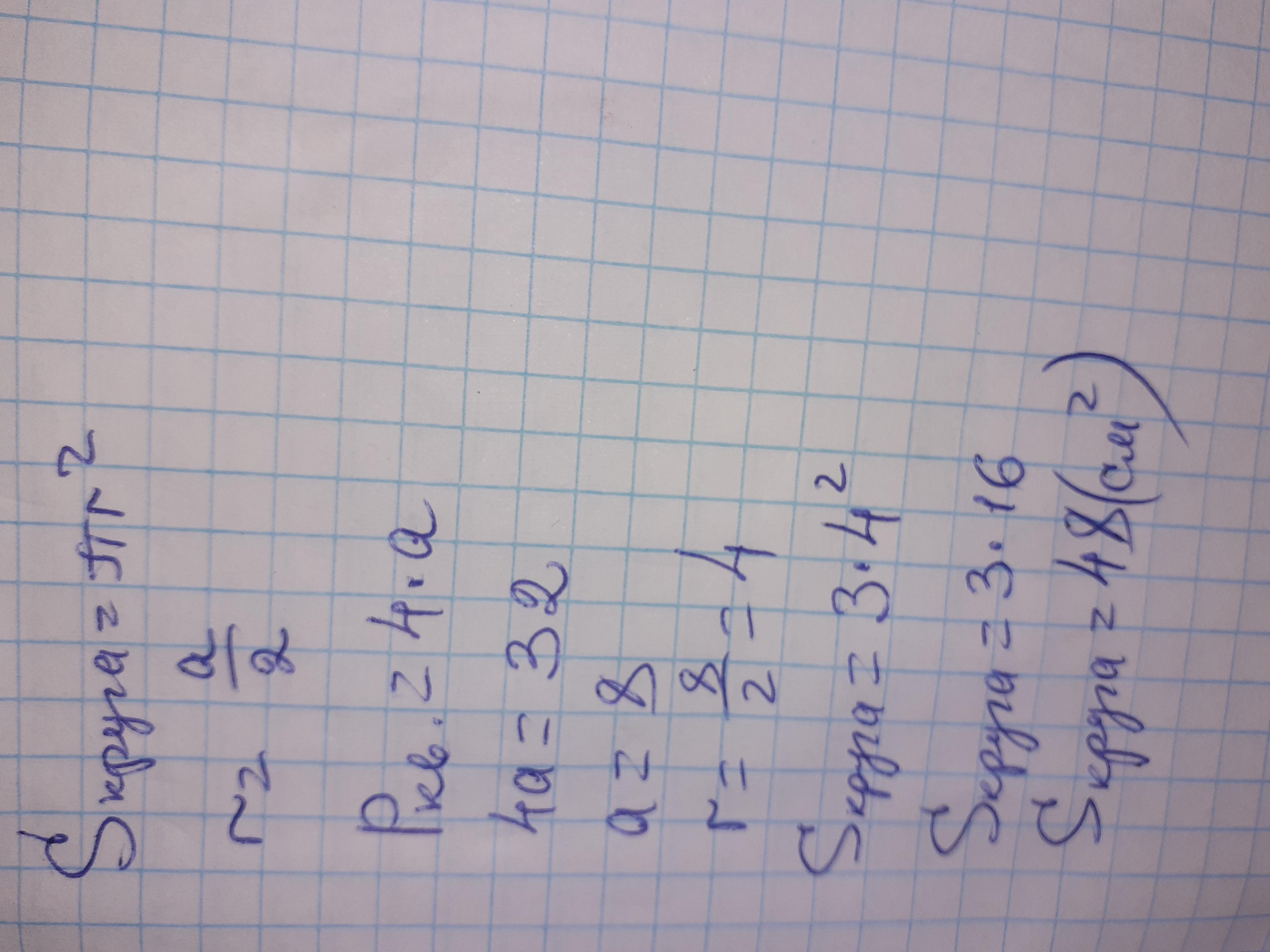 3) Площадь круга = ПИ * r^2 = 3 * 4^2 = 3 * 16 = 48 (см^2)