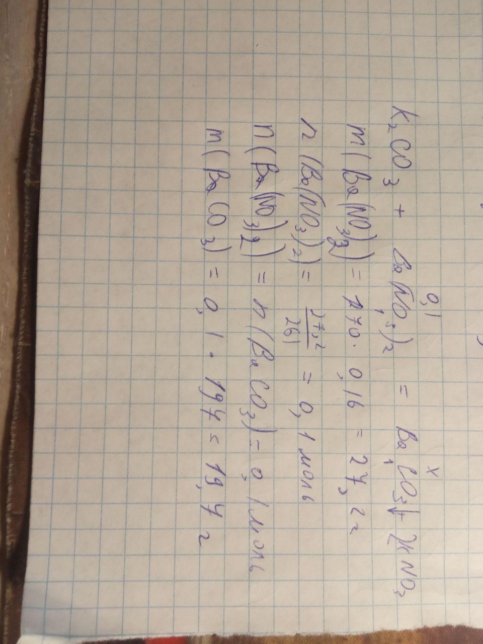 4) По уравнению реакции на один моль нитрата бария приходится один моль карбоната бария. Значит, количество вещества карбоната равно 0,1 моль.