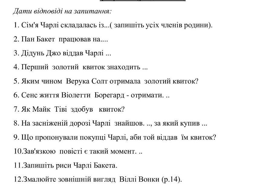 1. Його родина налічує шестеро людей: тато і мама Чарлі — пан і пані Бакети; батько й мати пана Бакета — дідусь Джо та бабуся Джозефіна; батько й мати пані Бакет — дідусь Джордж і бабуня Джорджина.