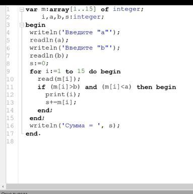 Составьте на языке программирования Паскаль программу для обработки массива из 15 чисел. Значения элементов массива задайте путём ввода с клавиатуры. Входные данные придумайте самостоятельно. Вычислите сумму элементов массива, не равных нулю, больших b и меньших a. Напечатайте номера элементов, которые удовлетворяют поставленному условию. Значения переменных a и b задайте самостоятельно. Заранее спасибо!