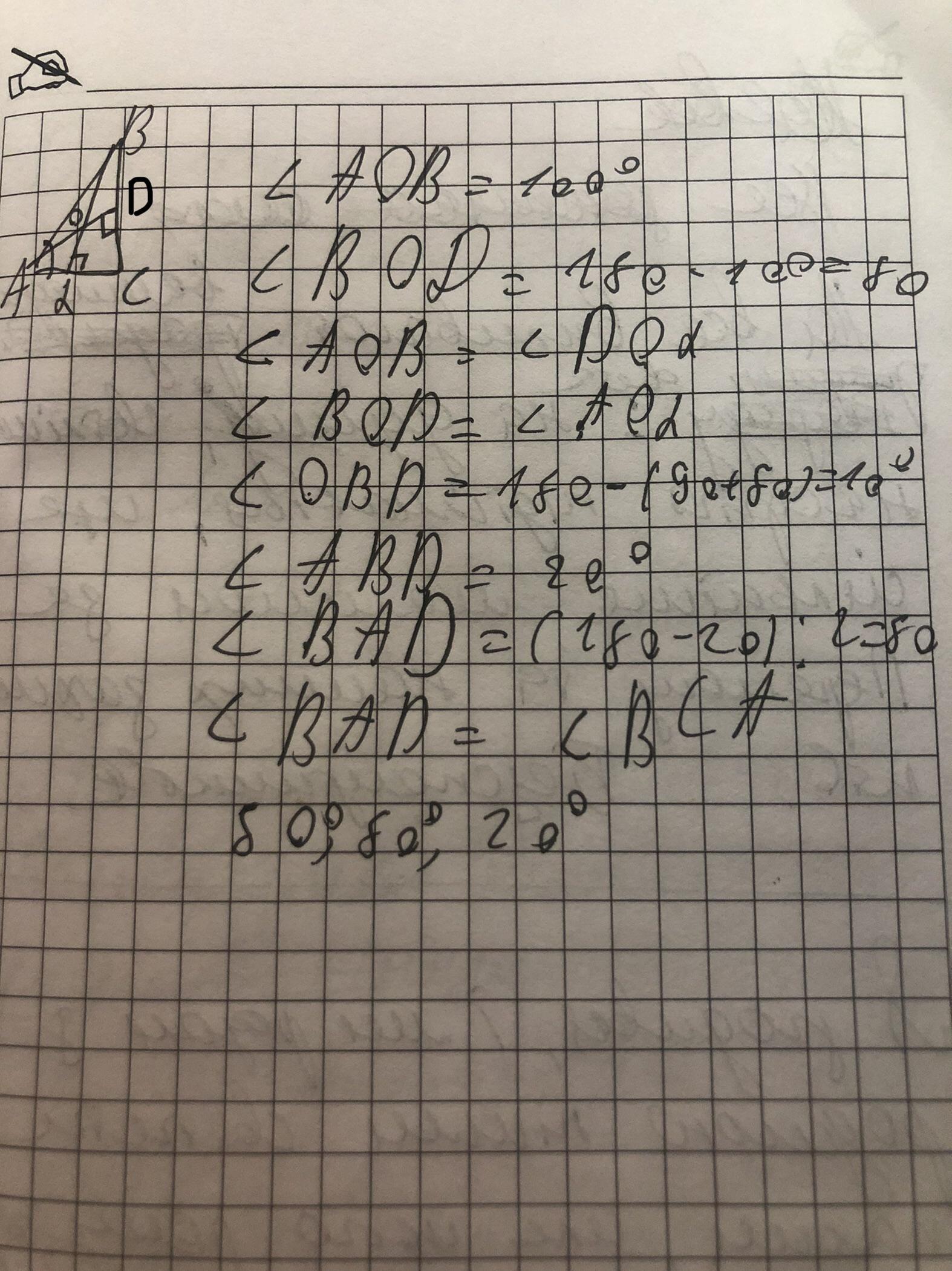 В равнобедренном треугольнике ABC с основанием AC из вершин А и В проведены биссектрисы,образующие при пресечение угол 100 градусов.Найдите углы треугольника.(помогите срочно)
