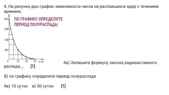 На рисунке дан график зависимости числа не распавшихся ядер с течением времени. По графику определите период полураспада