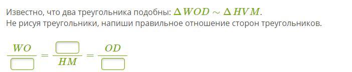 Известно, что два треугольника подобны: ΔWOD∼ΔHVM.