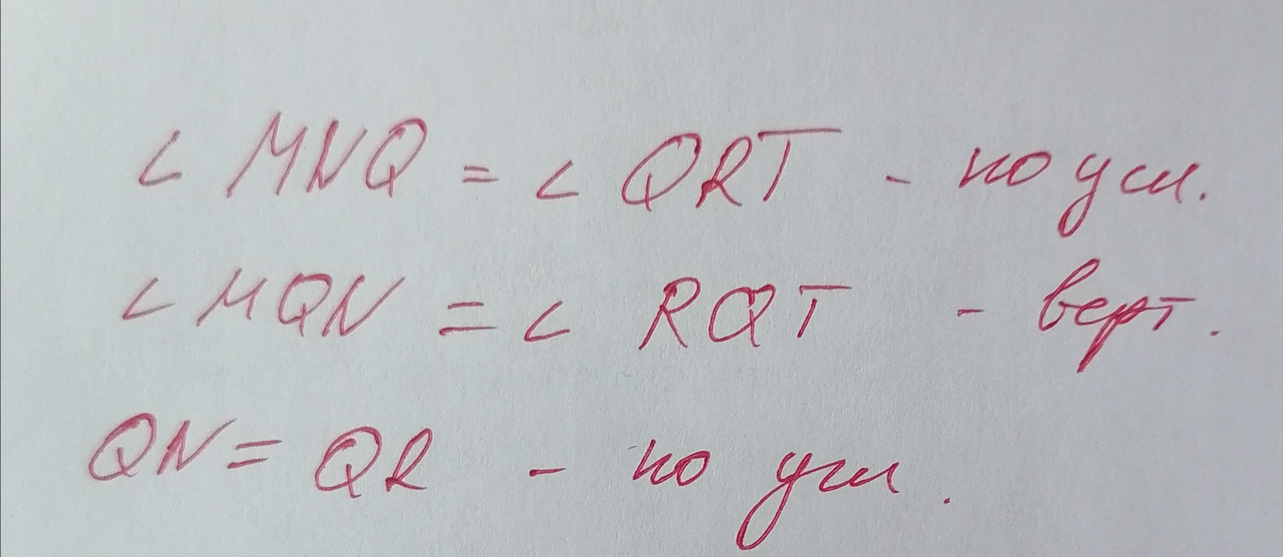 ∠MQN = ∠TQR как вертикальные углы;